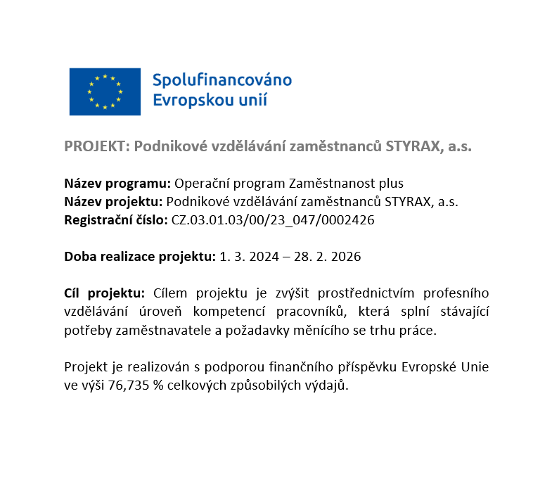 Projekt Podnikové vzdělávání zaměstnanců STYRAX, a.s. byl realizován s podporou finančního příspěvku Evropské unie v rámci programu Operační program Zaměstnanost plus.